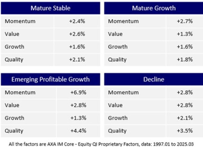 Our data indicates that stocks classed as Value - those which appear to be trading for less than their underlying worth - have seen the highest average excess returns among those in the Mature Stable stage of the lifecycle. However, Mature Growth companies have historically been more effectively selected based on momentum rather than quality.1
