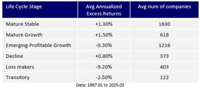 Traditional investment frameworks often overlook the importance of lifecycle dynamics. Most factor investing models evaluate companies based on size, value, growth or momentum – ignoring where a company stands in its natural evolution. For example, two firms with identical profit margins might be fundamentally different if one is scaling up while the other is in structural decline. Understanding where they are in their lifecycle can potentially highlight missing, different, or more nuanced information.