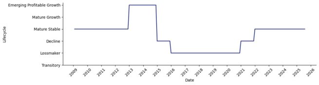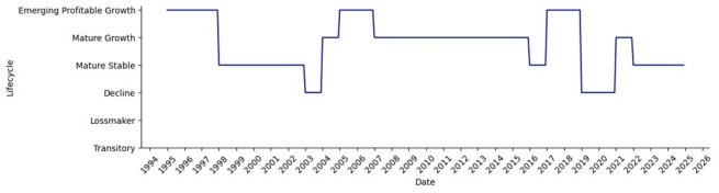 Companies are not bound to move linearly through lifecycle stages — they can reinvent themselves. It’s entirely possible for a firm in the Decline or Mature Stable stage to transition back into Emerging Profitable Growth. However, such a reversal typically requires meaningful innovation, a refreshed product line-up, and structural changes to reinvigorate a stagnating business model. We’ve observed several compelling examples of this kind of turnaround in practice; below is a series of charts showing how we classify the lifecycle stages of various large corporates over time, according to the framework above.