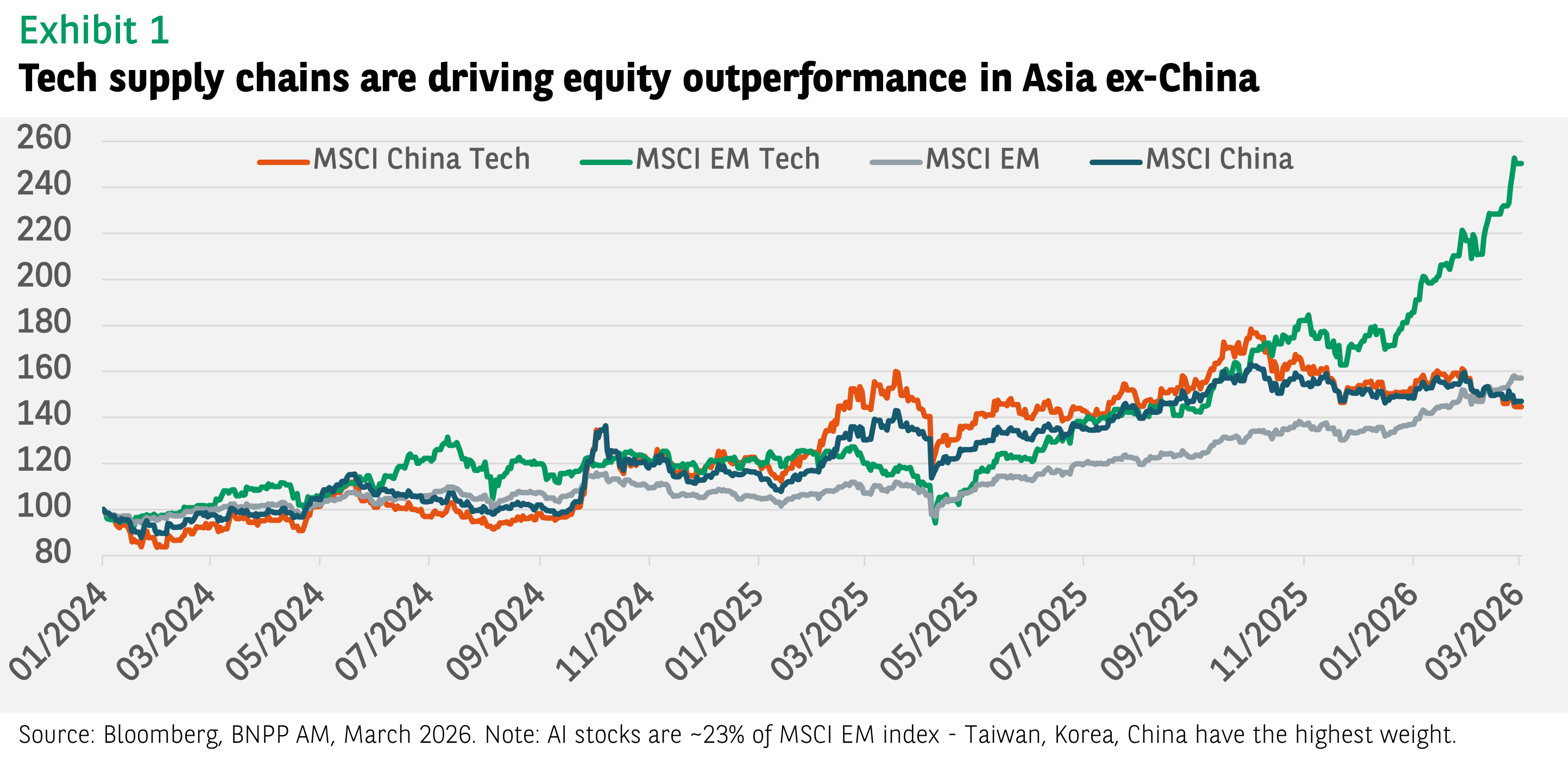 The divergence between Asian markets, especially in the technology sector, highlights a dynamic shift in the regional landscape, driven by the global artificial intelligence capital expenditure boom. Hardware hubs in Asia-ex China, notably Taiwan and South Korea, are thriving due to increased demand for high-end semiconductors and advanced packaging. China’s tech sector, however, presents a more nuanced picture. While recent policy reforms and domestic AI innovations like DeepSeek have spurred some recovery, the sector still trails regional peers. China is actively working to establish its own technological leadership and independence, across software and hardware domains. Ongoing headwinds such as US export restrictions and regulatory uncertainty have kept investors on the sidelines.