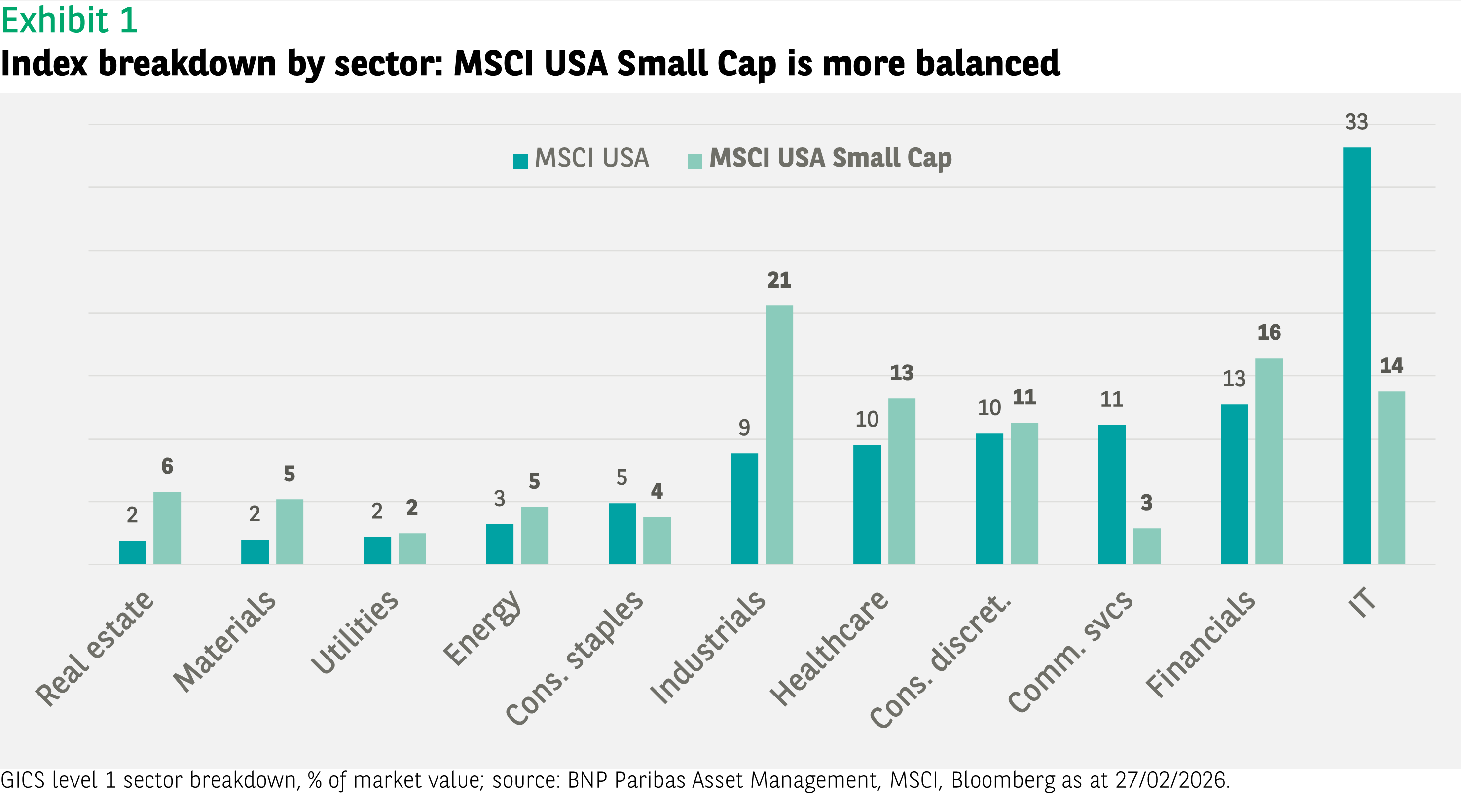 US small-cap indices tend to have a more balanced allocation to business sectors. Thus, the exposure to the technology sector, where we have seen a growing concentration of large and mega-cap companies in recent years (see Exhibit 1), is much more limited.