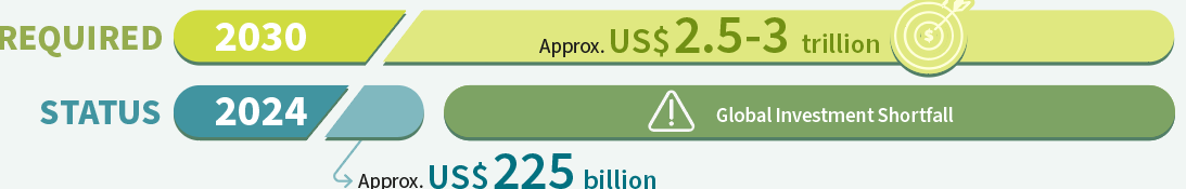 To reach Net Zero by 2050, approximately US$2.5-3 trillion is required annually globally by 2030, focusing on energy efficiency retrofits, low-carbon construction materials, electrification of heating and cooling, and integration of smart building technologies. In 2024, energy efficiency investments in the building sector were around US$225 billion3, suggesting a shortfall of about U$2.3 trillion a year.