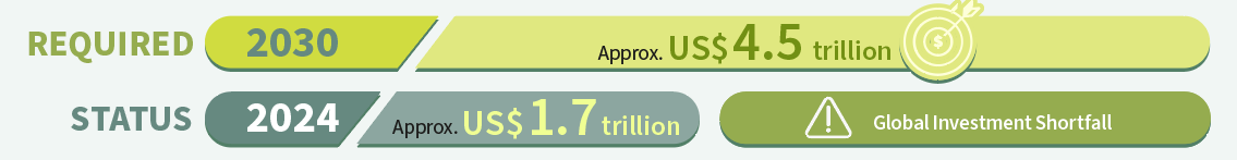 To reach Net Zero by 2050, approximately US$4.5 trillion is required annually by 20303, mostly in renewable power, grids, storage, and efficiency. In 2024, global investments in clean energy totaled approximately US$ 1.7 trillion4, suggesting a shortfall of US$2-2.8 trillion annually.