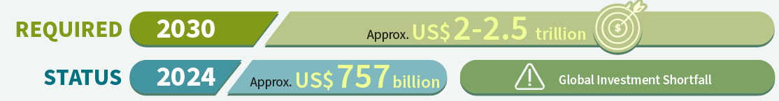 To reach Net Zero by 2050, approximately US$2-2.5 trillion is required annually globally by 20302. This includes investment in electric vehicle infrastructure, public transport, and rail electrification. In 2024, global investment in electrified transport reached a record US$757 billion3, suggesting a shortfall of about U$1.7 trillion.